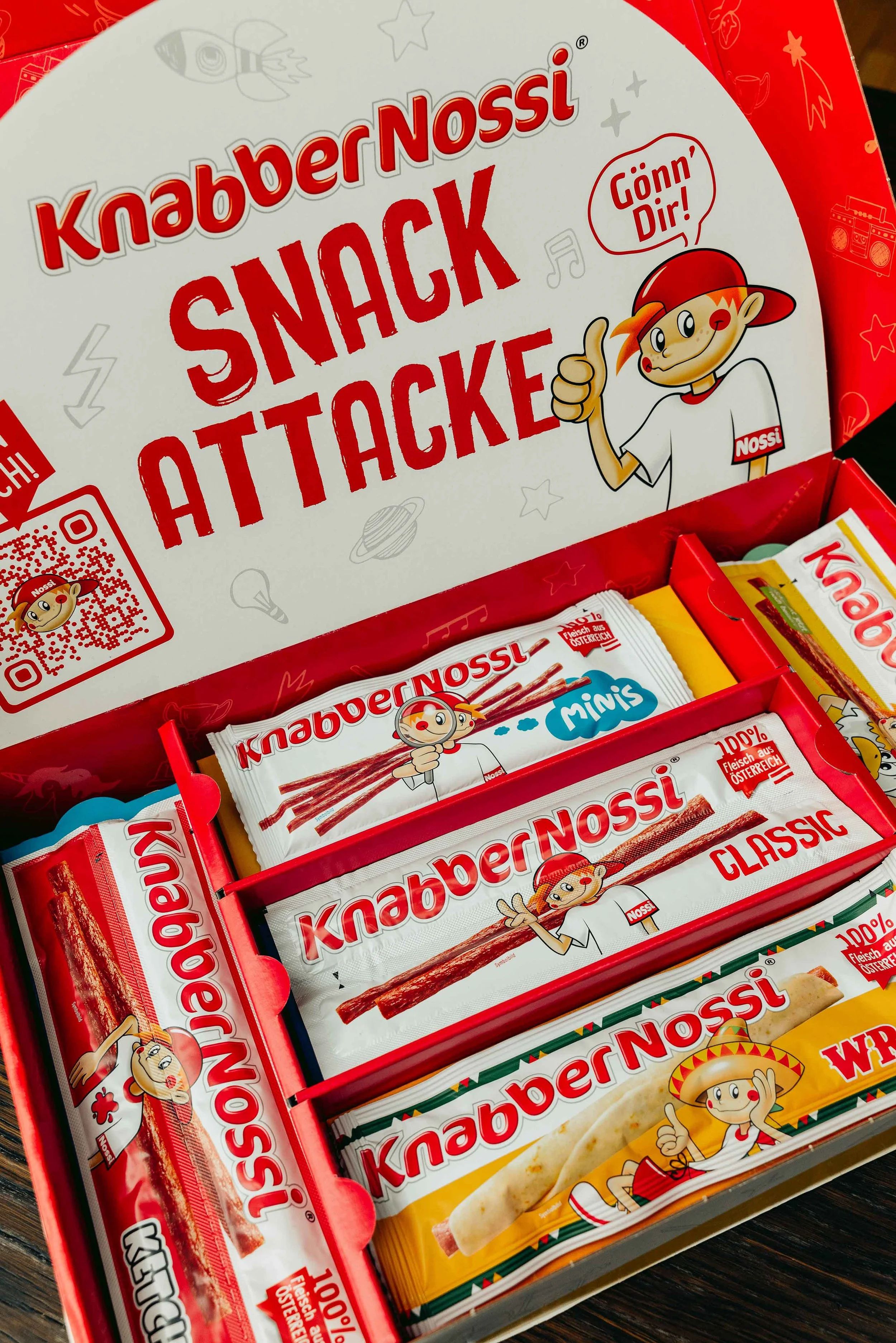 Für KnabberNossi übernehmen wir die komplette Betreuung – von Social Media über Events bis hin zu Design und Merchandising. Auf Instagram konnten wir über 12.000 neue Follower gewinnen, auf TikTok über 5.000. Mit zahlreichen Influencer-Kampagnen, kreativen Events wie im Zoo Schönbrunn, auf der Donauinsel oder am Weihnachtsmarkt, sowie neuem Packaging-Design und umfangreichem Merch – inklusive einer Kooperation mit einer lokalen Bekleidungsmarke – positionierten wir KnabberNossi als eine der sympathischsten Snack-Marken Österreichs.